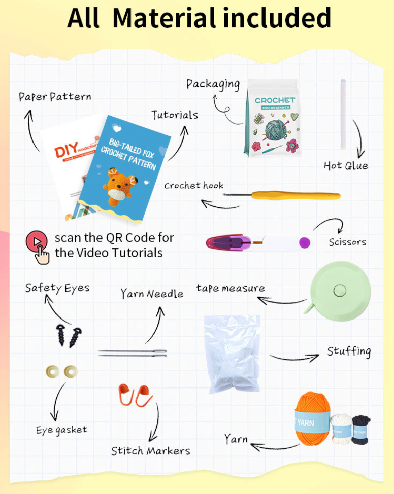 • 【Complete Crochet Animal Kit】We provide all the tools and materials you need, from pre-prepared crochet pieces, crochet hooks, yarn, stuffing, to video tutorials and basic crochet manuals. You can start right away without making any additional purchases.