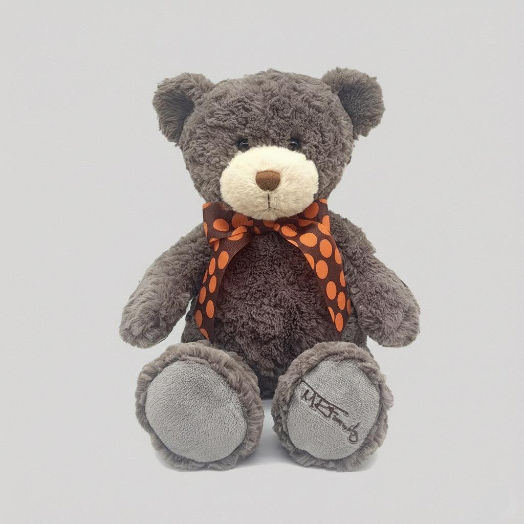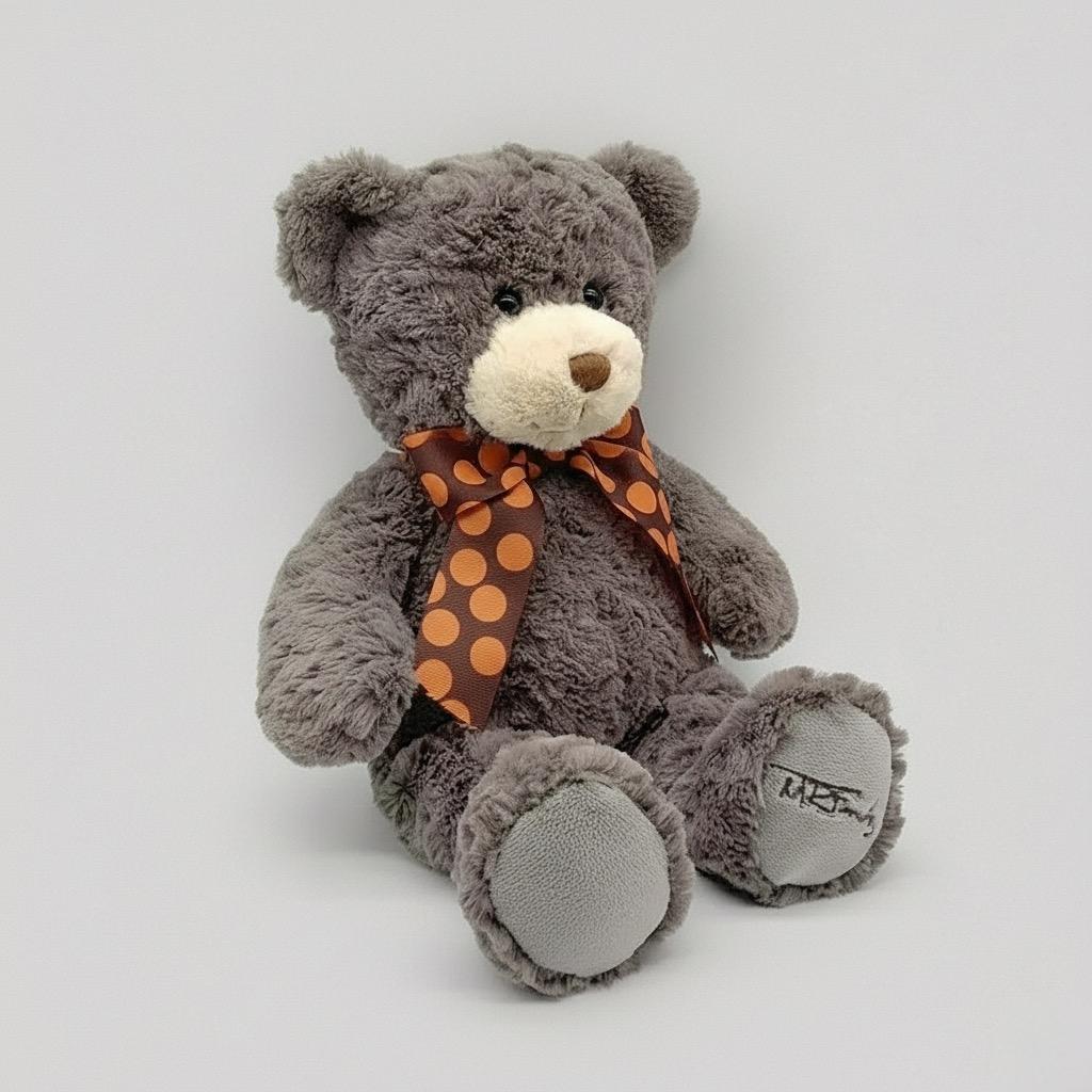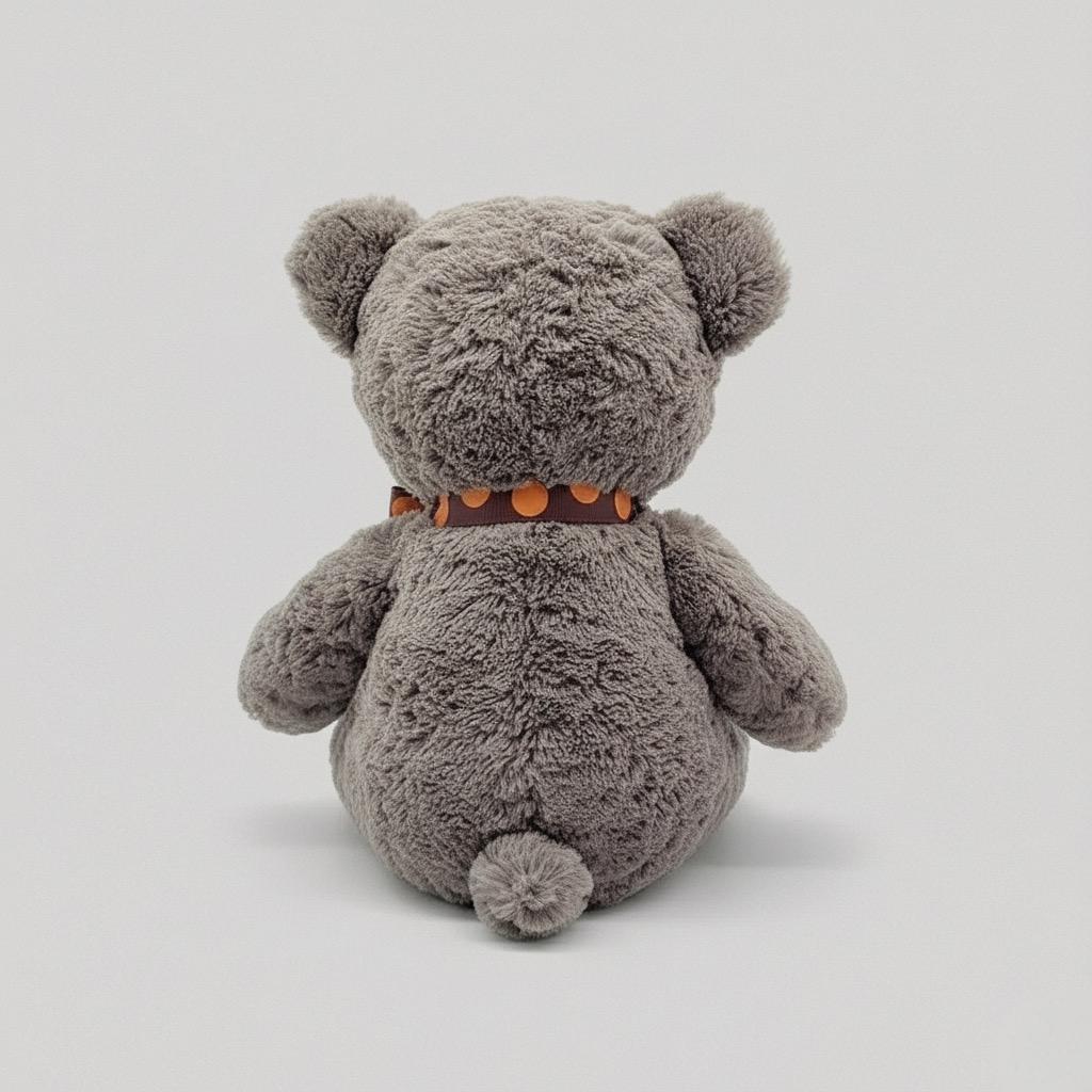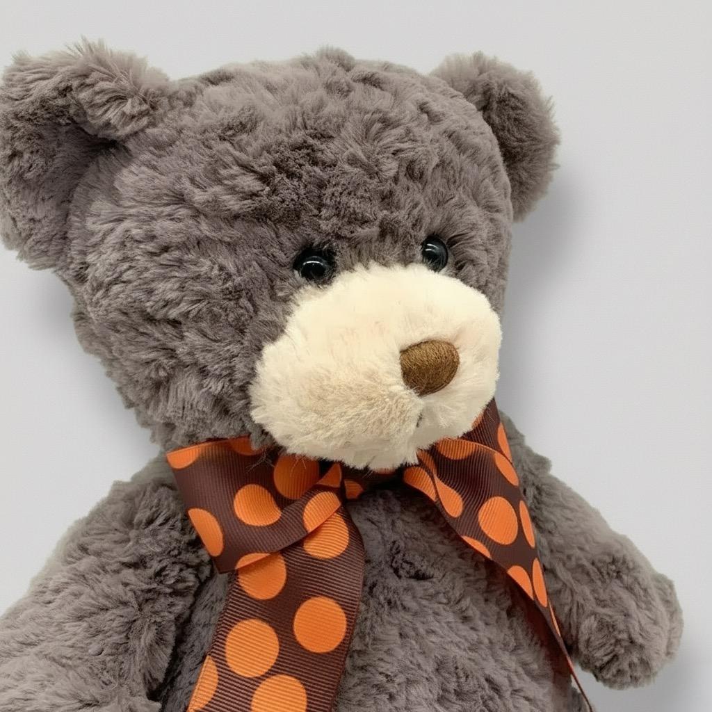 Charming Design: Adorned with a cute polka-dot bow, this teddy bear brings a dash of whimsy and charm. Its classic gray hue fits seamlessly into any decor, making it a lovely addition to bedrooms, nurseries, or even your office desk.